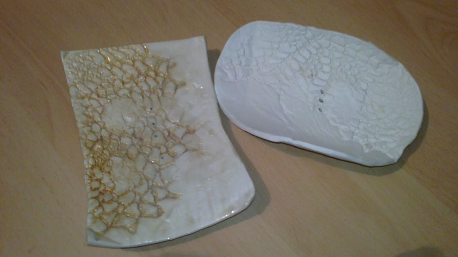 Ausschneiden und über eine Schüssel oder Flasche legen. Füsschen darauf und trocknen lassen. Die Ecken etwas mit Schleifpapier glätten. Lackieren oder bei Ton - glasieren und brennen lassen.